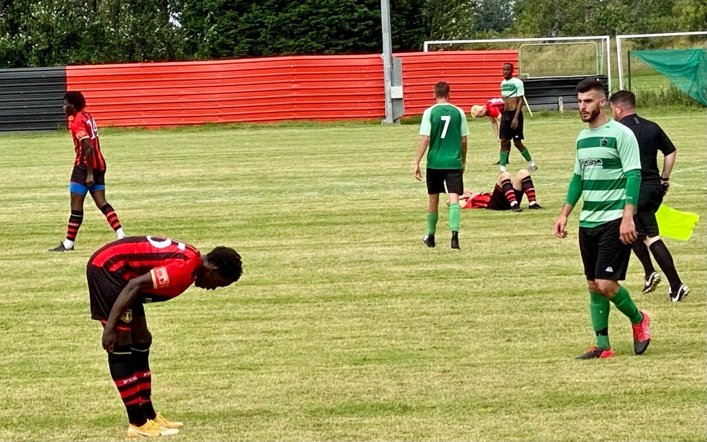 Woodstock Park stadium is beautifully set in countryside and served by a friendly and welcoming sports club with its own refreshment area and club bar. There is a small covered stand at one side of the pitch and another behind the goal. The pitch is grass, which looked to be level and in good condition. This match was played on the afternoon ahead of an evening Euro 2021 quarter final fixture, between England and Ukraine, which may well have curtailed the attendance. The entrance was free for this match, with donations being requested instead, for the Demelza House hospice appeal.