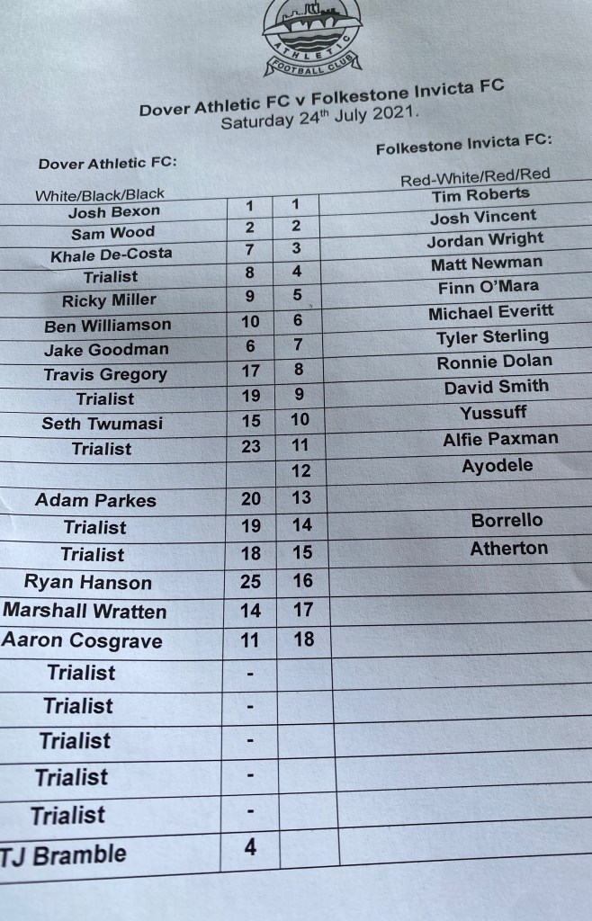 Dover made a number of changes at the half time break, to give their triallists a chance. Folkestone put pressure on from the restart and Tyler Sterling scored an equaliser on 57 minutes with a neatly curled finish from a free kick.