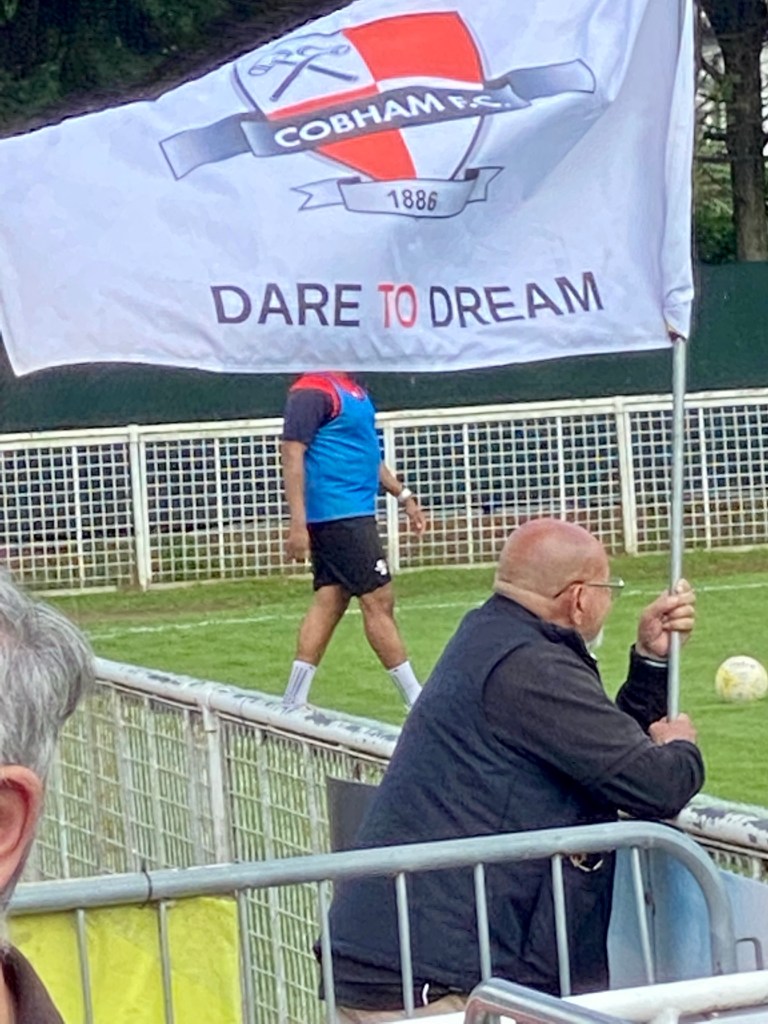This was an FA Cup extra-preliminary qualifying round match between Cobham FC, who play at Step 5 as part of the Combined Counties League Premier Division South and Sevenoaks Town who play at Step 4 as part of the Isthmian League South East Division. The stadium announcer reminded the fans that it is only 14 games before Wembley!