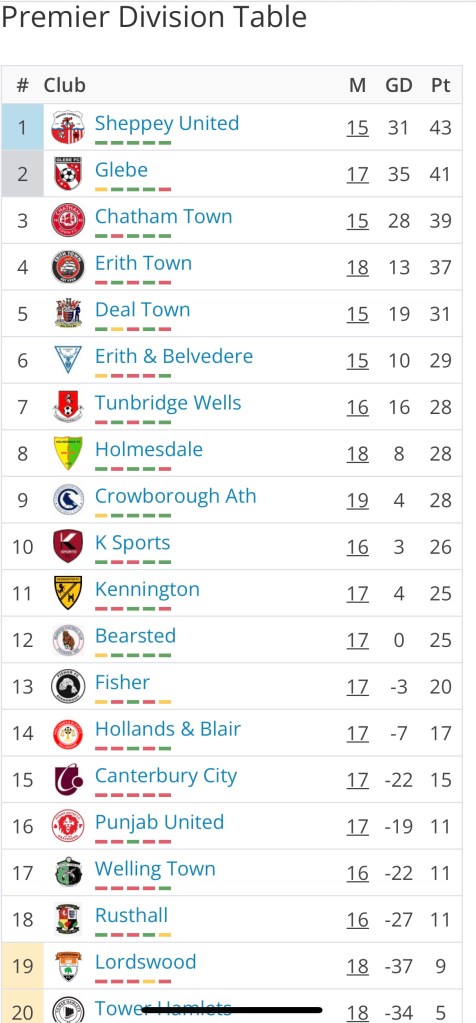Chatham Town close behind Sheppey and Glebe, in third place, but with two games in hand on Glebe, were away at bottom placed Tower Hamlets and would be waiting eagerly to see the result and hoping to close the gap. Glebe lost to Welling Town in a shock result in the week and came into this game really needing to win.