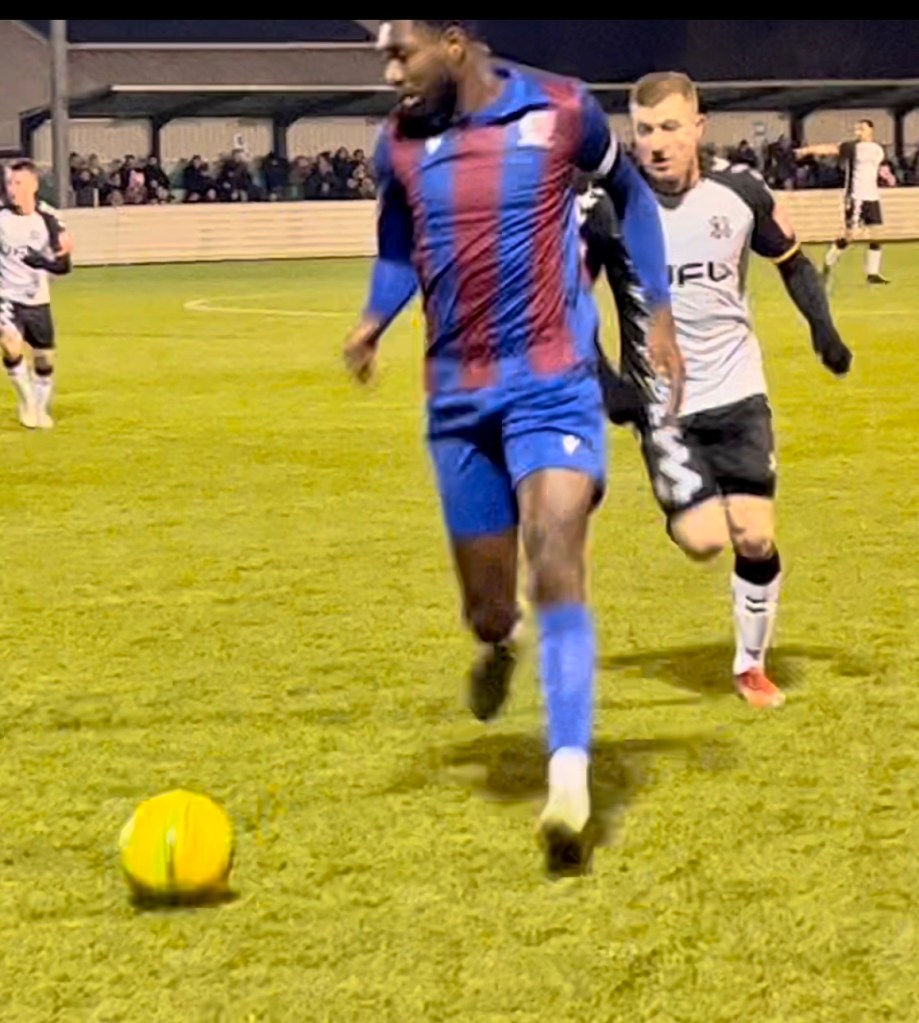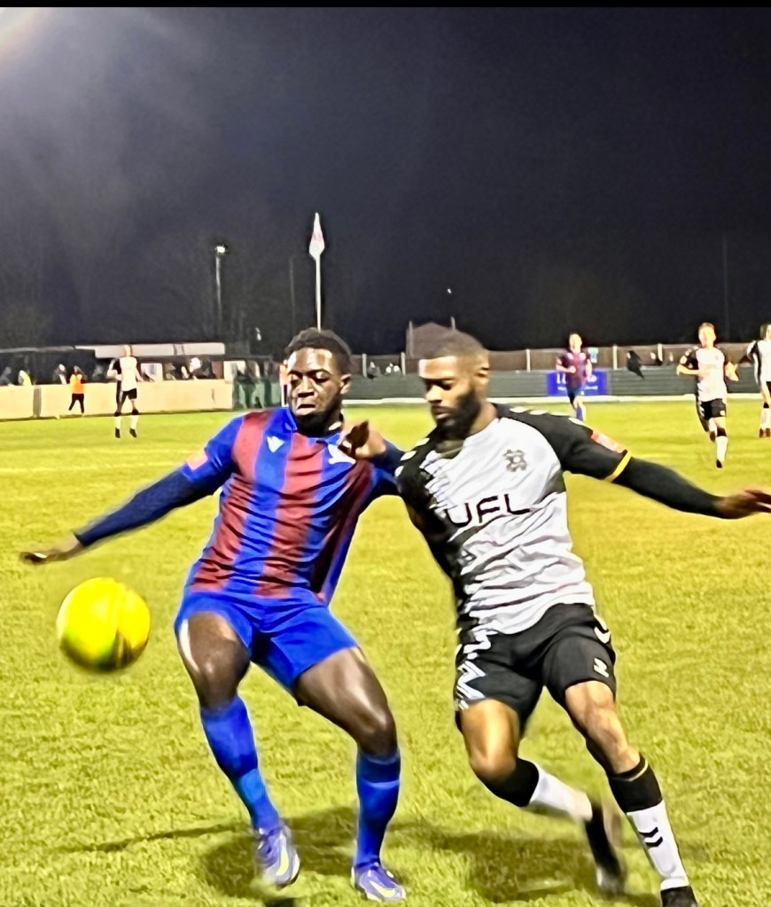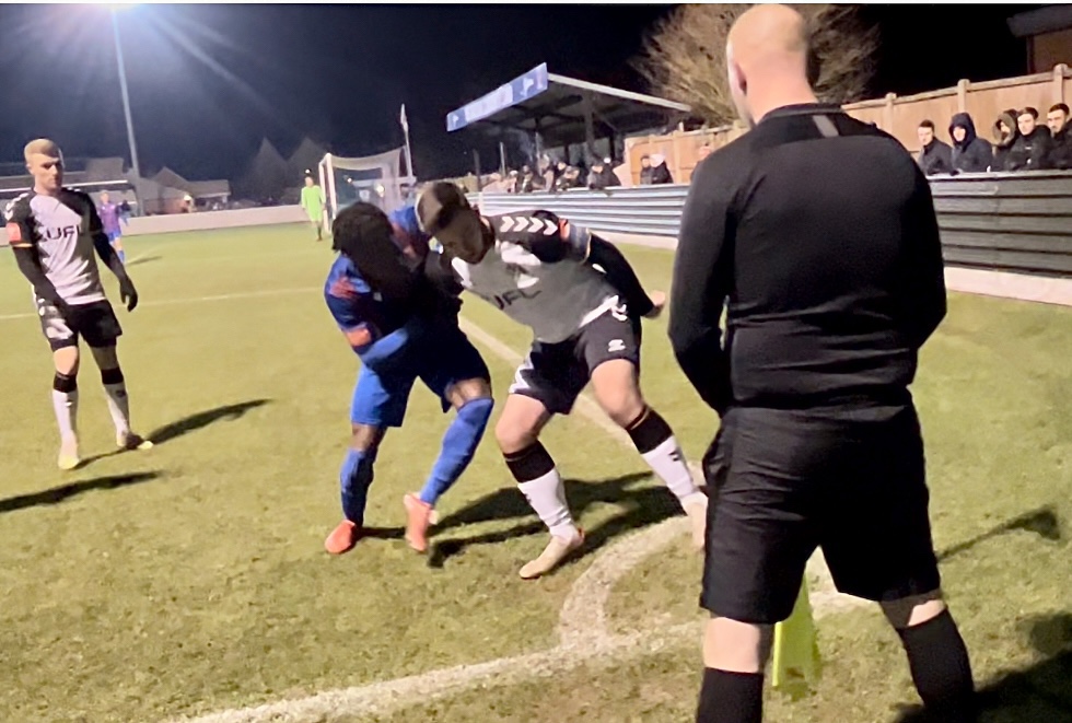 The game continued with both sides creating Chances at both ends. On 37 minutes the referee reduced Maldon & Tiptree to nine players, when Ngandu was dismissed after abusing the referee, after a penalty claim was turned down.