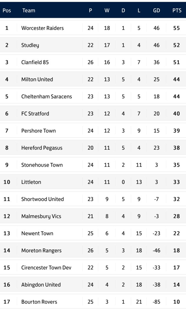 The table prior to the game shows Studley sitting just three points behind leaders, Worcester Raiders, but with two games in hand. Studley also show a two goals a game goal difference, which hopefully indicates that this will be a high scoring and entertaining encounter. Malmesbury Victoria are in mid table comfort, sitting in twelfth place.