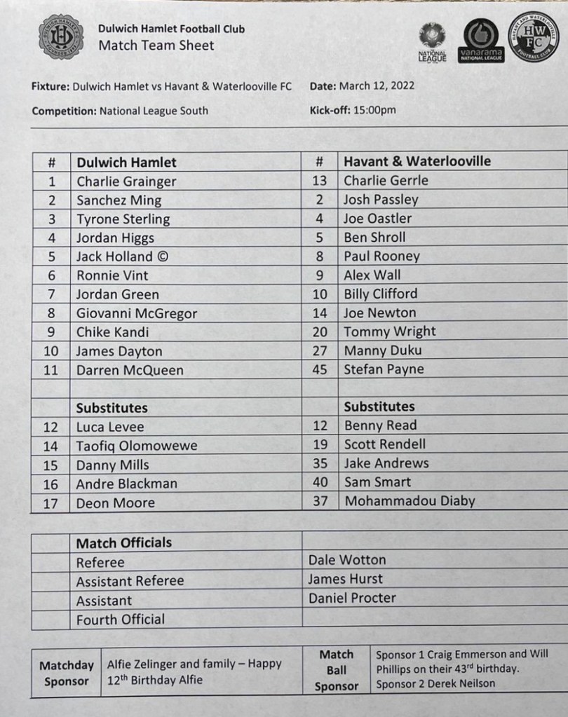 Dulwich Hamlet FC come into the game after a really positive season, sitting within the play off spots, in seventh place. Havant & Waterlooville FC sit back in twelfth place but, with a game in hand, could still make the play-offs with a decent run. Danny Mills has top scored this season for Dulwich Hamlet FC with ten league goals. Havant & Waterlooville’s Tommy Wright is their top scorer, this season, with seven goals.