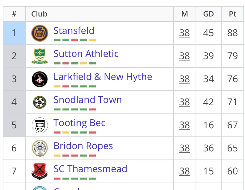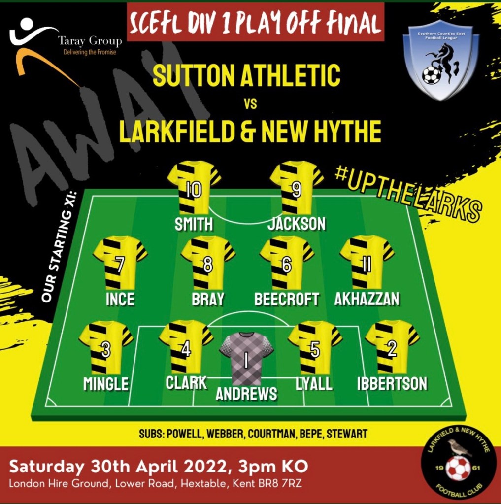 The second half saw Larkfield & New Hythe fade, as the exhaustion of 120 minutes of play with just ten men, really took its toll. At the final whistle it was Sutton Athletic who celebrated the victory and claimed the promotion place to the SCEFL Premier League, for 2022/23.