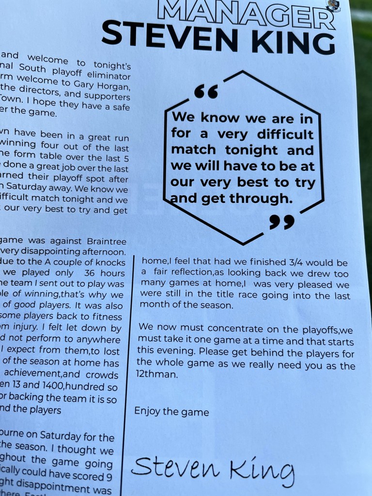 Manager S King – Wise words in the programme for all…especially the reds in next four games 🙂🙃
