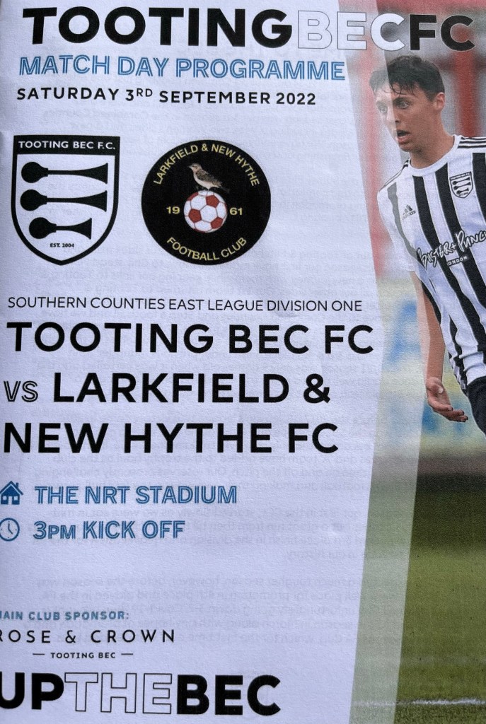 Tooting Bec have had a harder opening to the season, losing away to leaders Lydd Town, and second place Rochester United. However they have also secured points against Meridian VP and Croydon in hard fought draws, as well as comprehensively beating Bermondsey Town away. Manager Matt Hancock (not that one!!) knew that a win against a side with the quality of Larkfield & New Hythe today, would signify his team’s intent to push into the play off places and beyond, this season.