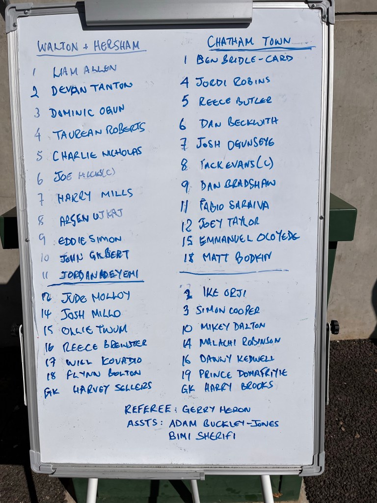The game opened with Walton & Hersham in the ascendency. Their passing play was short and fast and the Chatham Town midfield seems to find it hard to retain the ball when they were able to reclaim it. In the 17th minute Jordan Adeyemi pounced upon the ball and fired the home side 1-0 ahead.