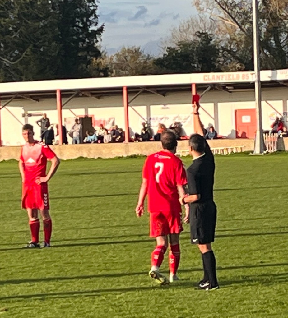 Within five minutes of the restart the referee sent off Clanfield 85’s Nate Robinson for kicking out in anger at an opposition player.
