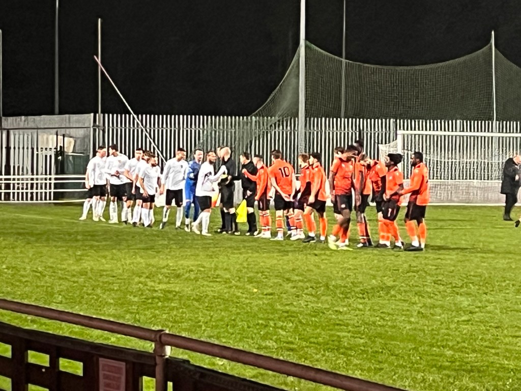 Teams shake hands prior to kick off. Lordswood in orange shirts and black shorts, Kennington in white shirts and black shorts.