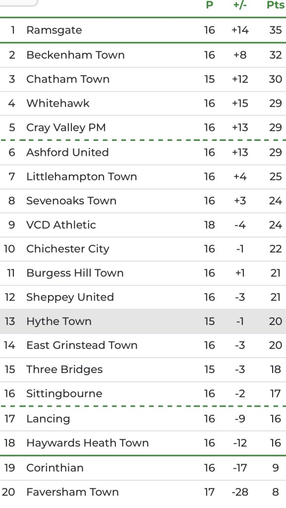 Chatham Town came into the fixture in third place in the league, with thirty points from 15 games. Manager and owner, Kevin Hake, has seen his Chatham side stumble in recent weeks with two defeats in the last two away games at Three Bridges FC and Cray Valley Paper Mills.