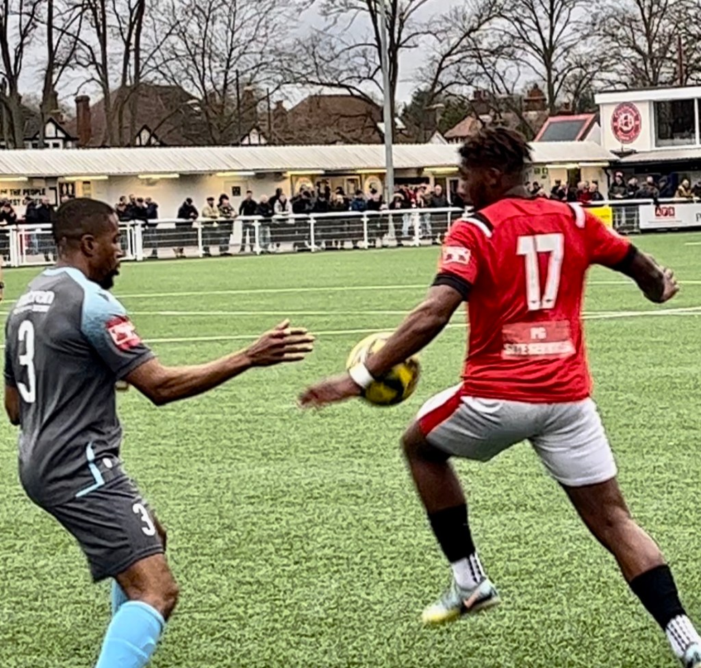 On 30 minutes the ball found its way down to Chatham’s Daniel Thompson, in the Three Bridges area, who finished from close range, putting Chatham Town one nil ahead.