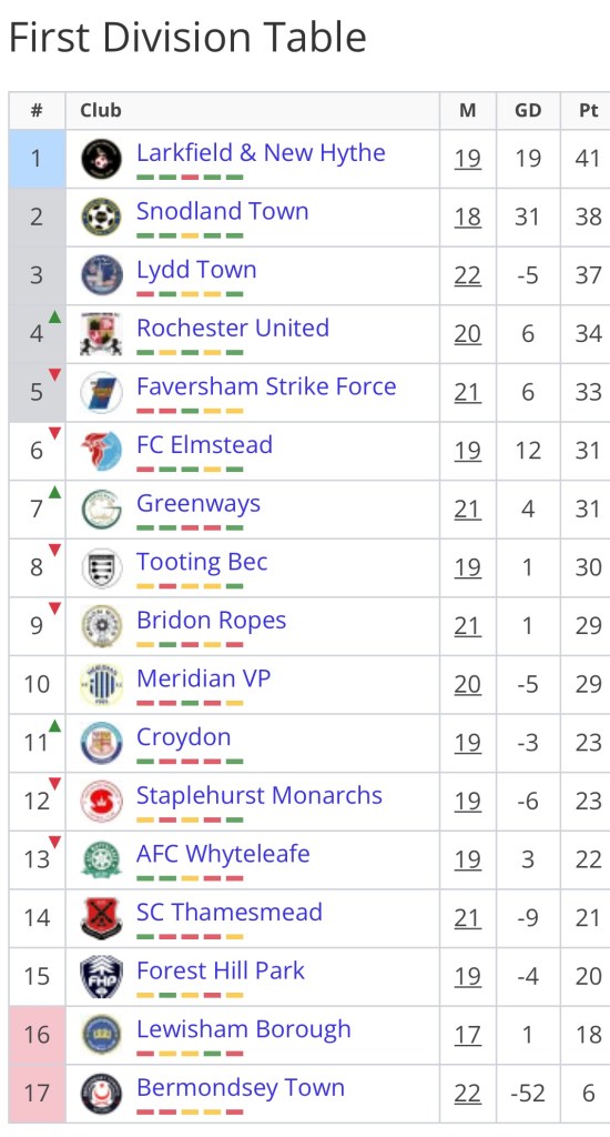 This week’s midweek evening fixture brought me to another local ground, to watch Snodland Town, sitting high in second place, in. the Southern Counties East Football League (SCEFL) Division 1, against Forest Hill Park, who came into the game in fifteenth place, just two points above the relegation places.