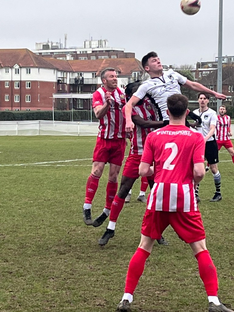 To their credit Bexhill United didn’t crumple at this point, but instead came back with attack after attack, making full use of the strong wind in their favour. Aaron Cook came closest for the home side, striking the cross bar from the edge of the Steyning Town area.