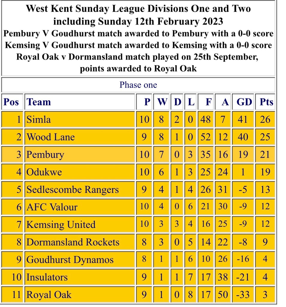 League Table – Courtesy of http://www.ksfl.org.uk