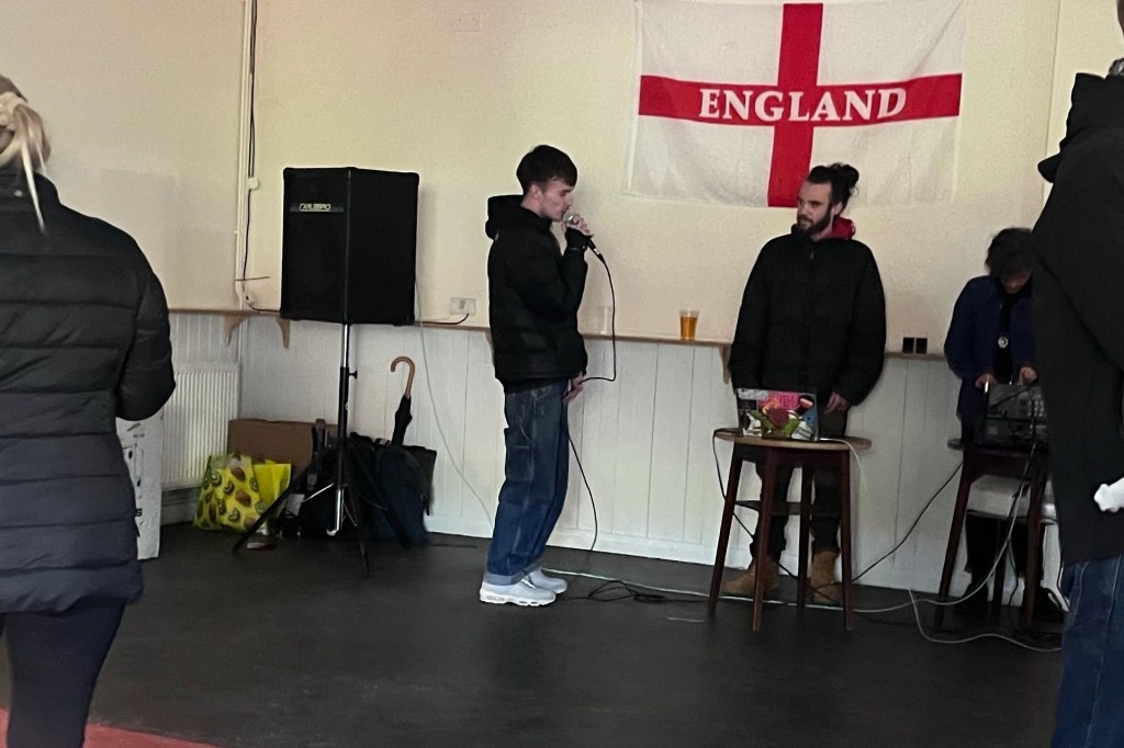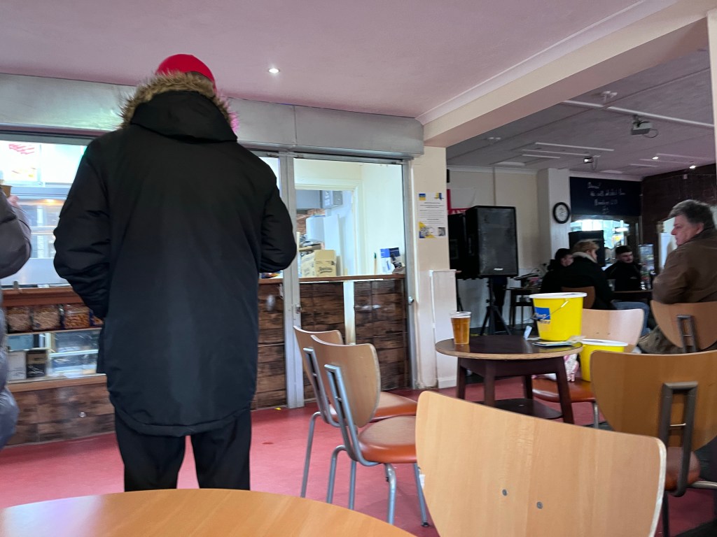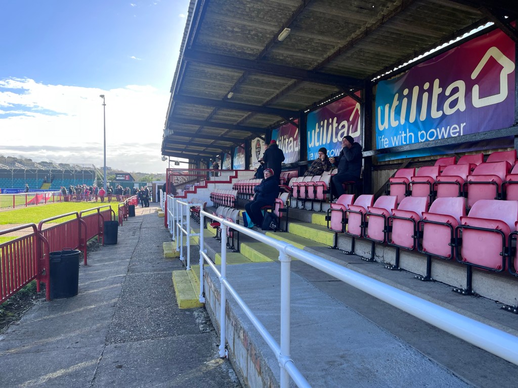 The ground is sheltered (enclosed) by parkland and hills around it and benefits from a decent sized clubhouse with a bar and burger/chicken shop. Whitehawk have two grandstands at the Enclosed ground, with significant levels of covered seating. There was live music in the clubhouse and free blood pressure checks. Outside the club tannoy played 90’s dance and even local favourites, the Go Team, to keep the atmosphere up, in the warming winter sun.