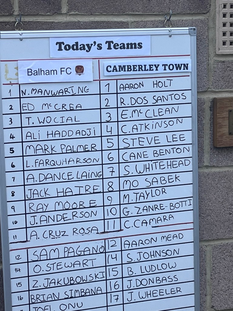 The first half was then very evenly fought. Balham continued to press down the left with Cruz Rosa as well as looking for a long ball to reach Moore, who had scored the opener. Camberley used the height and strength of Taylor and Zante-Botti, to cause problems for the home side.