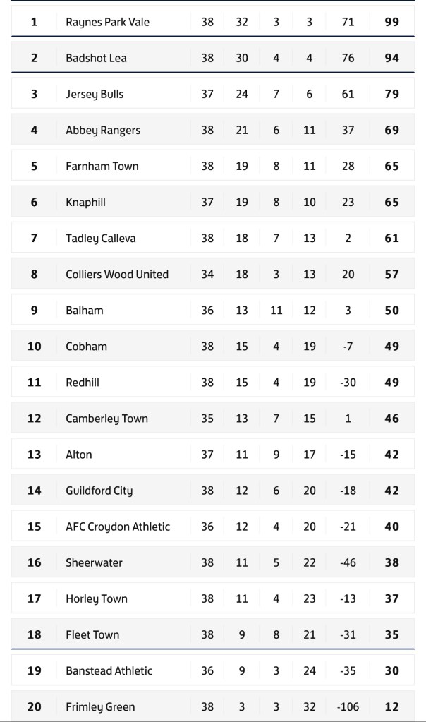 Balham sit in mid table safety, ninth, with 50 points from their 36 games. Today’s opponents, Camberley Town, are also safe, in twelfth with 46 points from 35 matches.