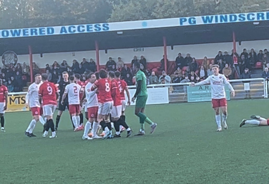 In the 35th minute a bad challenge by a Whitehawk player, resulted in an on pitch fracas, which led to yellow cards for Evans and Walker.