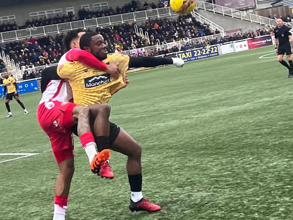 Then in the 42nd minute the skilful Jacob Berkely-Agyepong was pulled down in the box by Louis Thompson, which gave the home side a penalty. Sam Corne stepped up and boldly fired his kick past the reaches of Taye Ashby-Hammond to send the Gallagher Stadium wild and put the Stones into an unlikely lead.