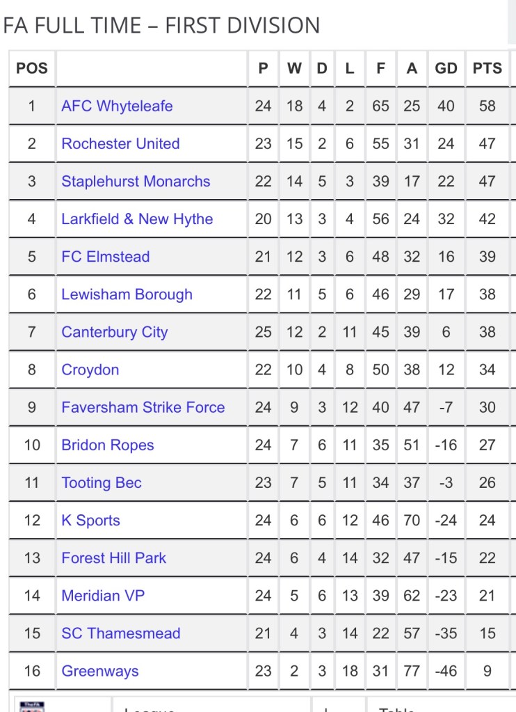 Faversham Strike Force have had a disappointing season, coming into today’s game in ninth position, with nine wins, three draws and 12 defeats from their 24 games. Their defence has leaked goals at a rate of almost two per match. Goals have come readily, with forty being scored in their 24 matches, with Marshall Wratten (13 goals) and Tom Barton (12 goals) leading the way. Manager Gary Axford would have wanted his side to kick start their season, going into a final run of eight matches, with a win against one of the league’s high fliers!