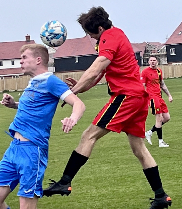 With just two minutes of the first half remaining, New Romney’s Warren Smith followed up after a long range free kick to head home bravely.