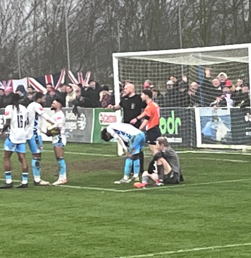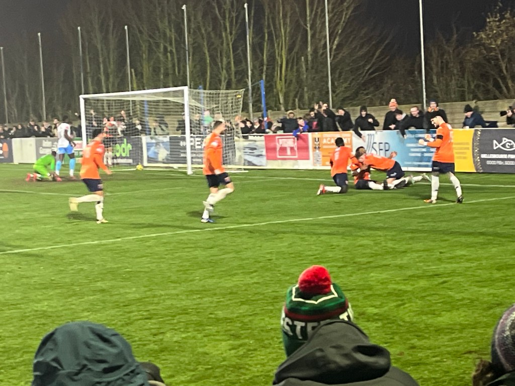 Just when the game seemed to have slipped back in favour towards Kettering Town, Owen James broke free for Stratford Town and lobbed Daniel Jezeph in the away team’s goal to make it 2-2. Unfortunately I missed filming the goal, but caught the immediate celebrations!