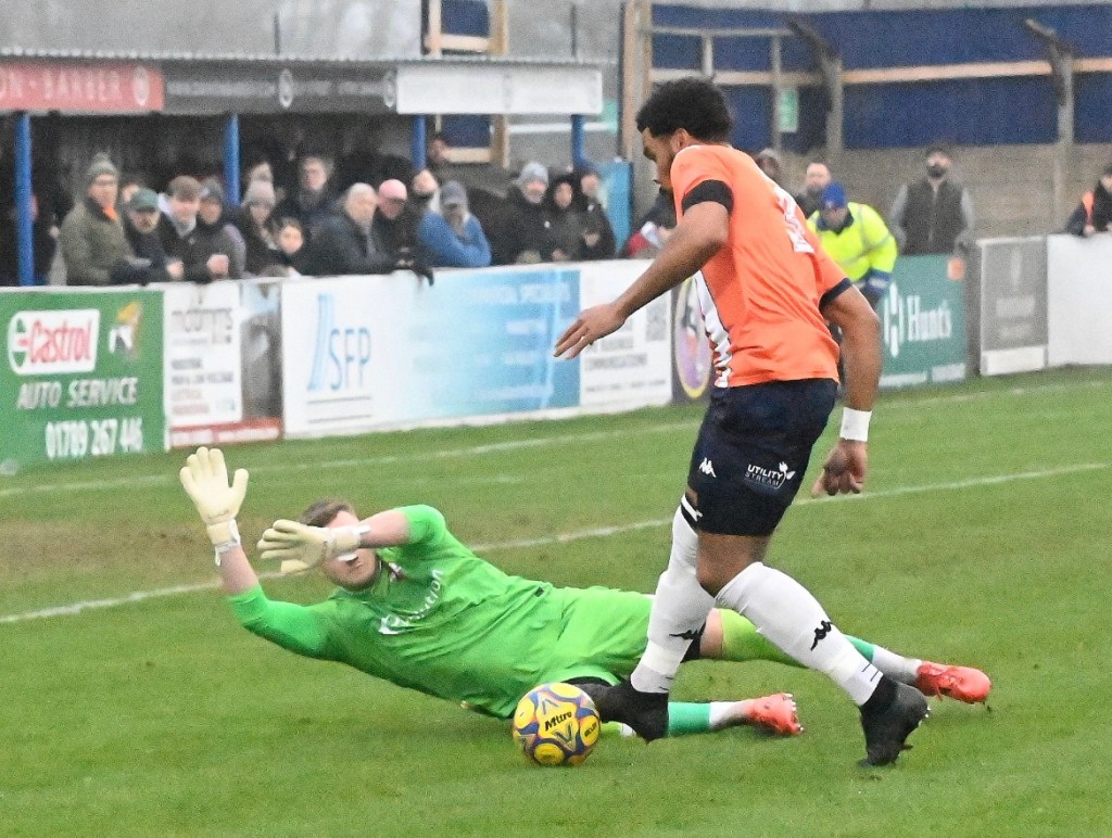Ten minutes later Isiah Noel-Williams, goal scoring star from Kettering’s televised second round FA Cup Tie with Doncaster Rovers, saw a point blank shot well saved by Jacob Weaver in the Stratford Town goal, when he was one on one and through on goal.