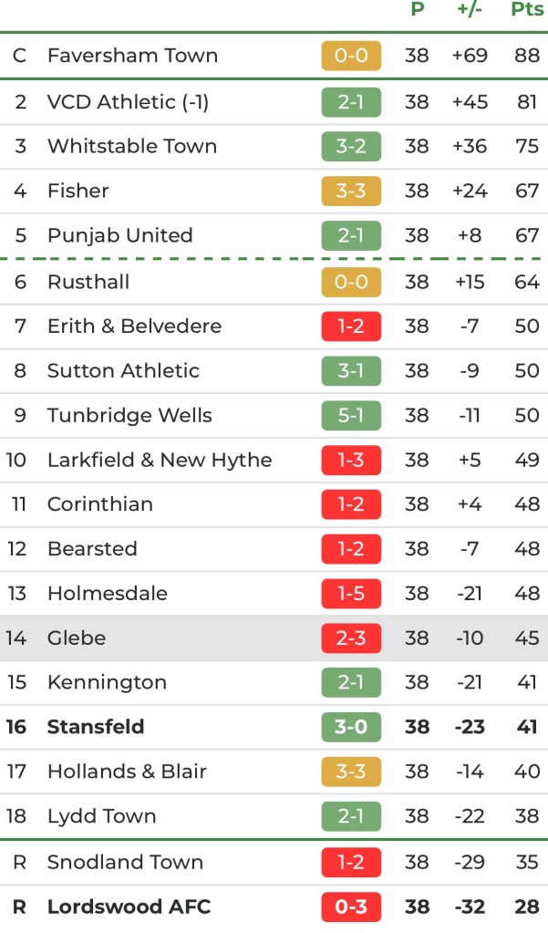 Stansfeld had their destiny in their own hands and a win or draw at Lordswood would save them, while Lydd Town needed to match Snodland Town’s result, whilst not winning or losing by more than a five goals difference to Snodland to stay up. Add into the mix that an FA charge against Lydd Town for the fielding of an ineligible player in a Sunday league fixture could see them being docked points, which would make all of today’s results meaningless. Confused? Well it’s the final day relegation conundrum so what would we have expected?