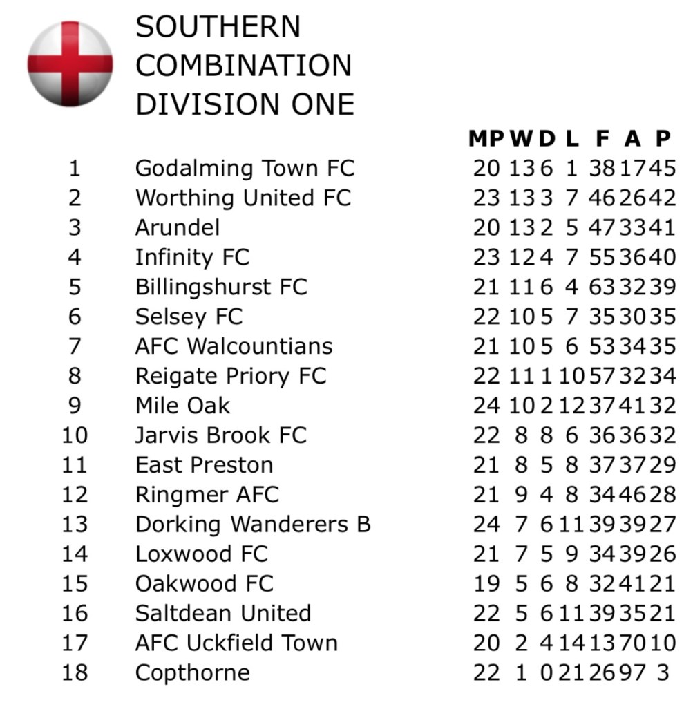 Godalming Town have put themselves in the driving seat in the SCFL Division 1 this season. They lead by three clear points from rivals Worthing United, but have three games in hand over them. The G’s have won thirteen, drawn six and lost just once under manager Mo Sher this season, hoping to secure the promotion they narrowly missed out on in 2024-25 when finishing third. Goals have come at a rate of almost two a game, with Mark Soares, (17 goals), Tayo Adekoya (7 goals) and Will May (6 goals) leading the way.