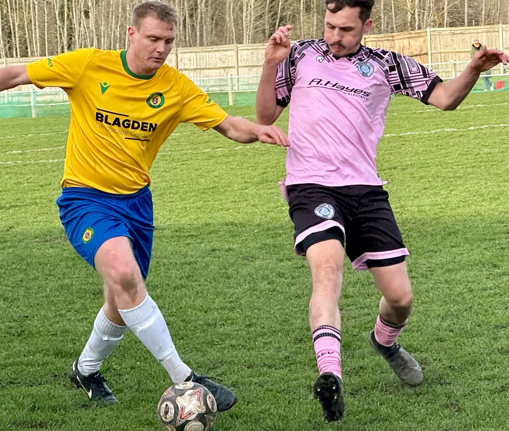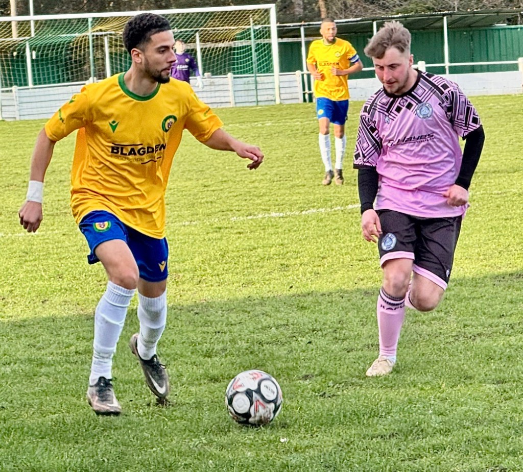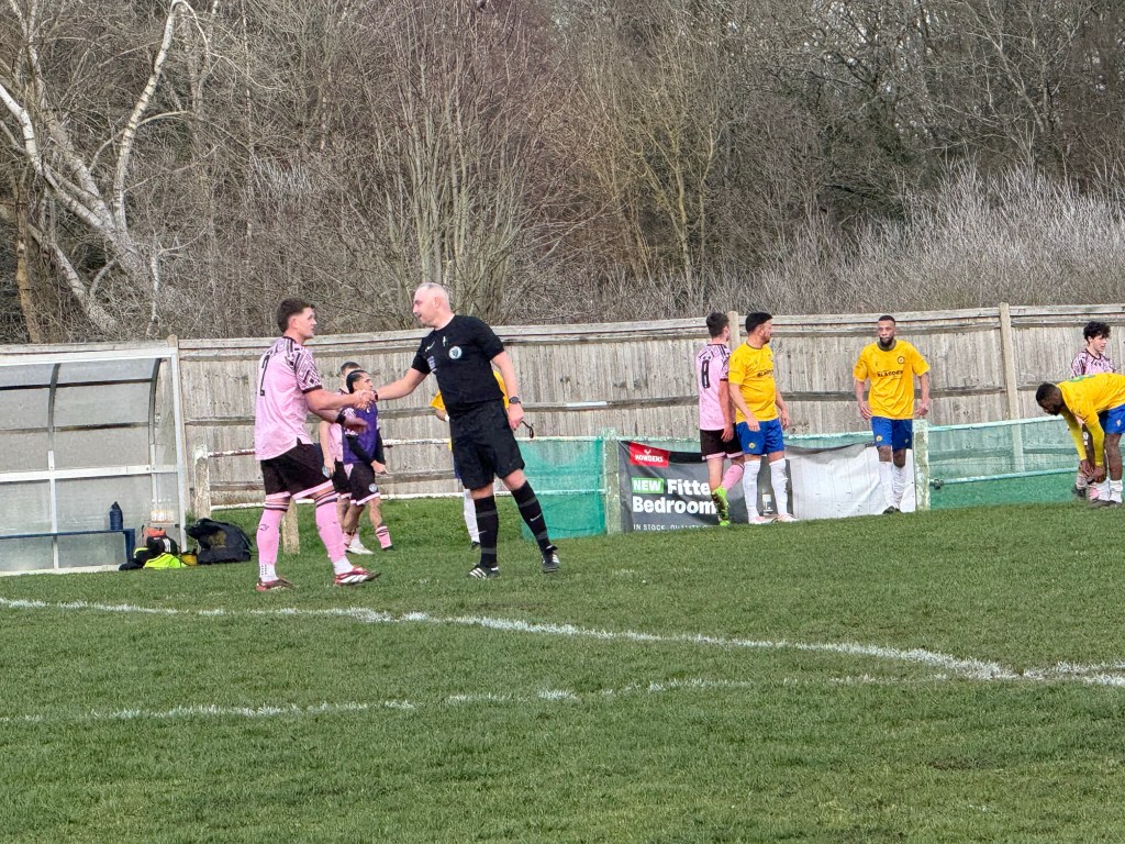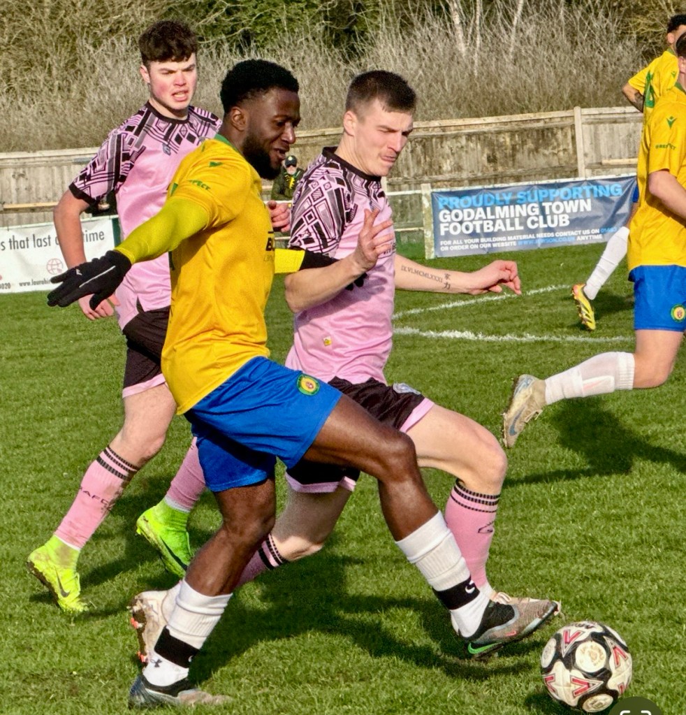 The game kicked off in bright winter sunshine, with Ringmer AFC in their change pink and black striped and Goldalming Town in their yellow and blue kit. The first half was closely fought with few clear cut chances as the players struggled to find their true passing range.