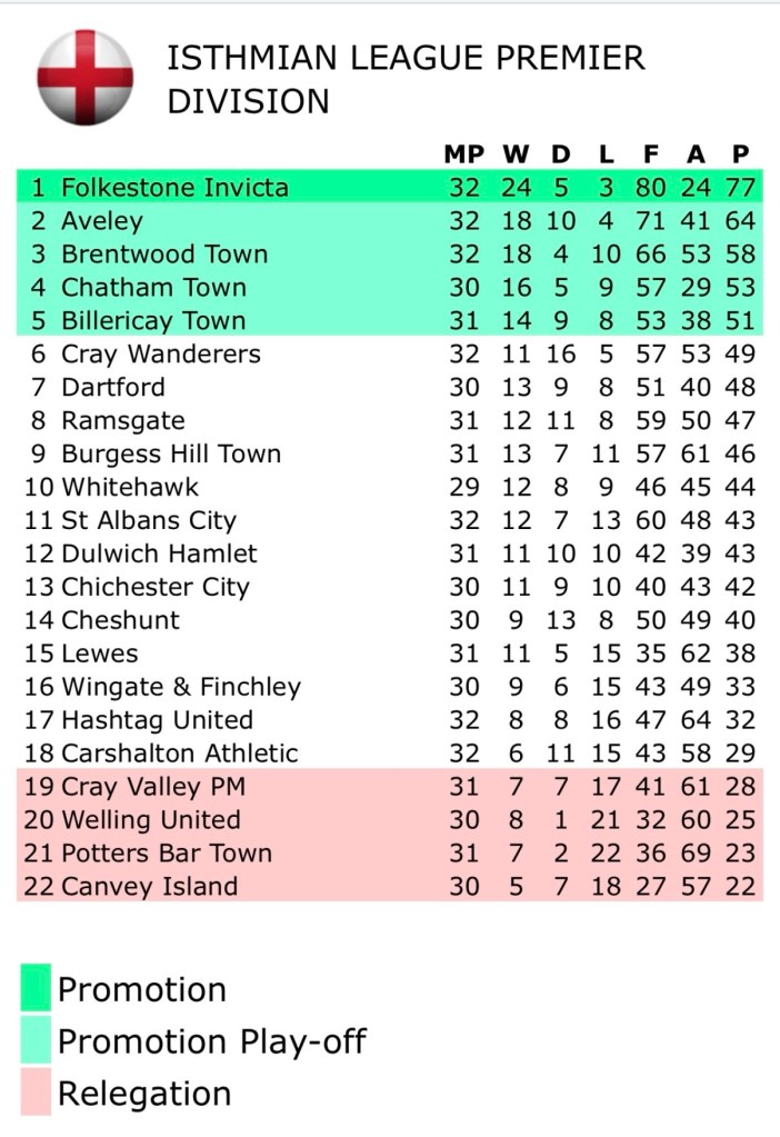 Chatham Town’s manager and owner, Kevin Hake, will have wanted his side to cement their play off places in the same two back to back fixtures. He has seen his side create record this season, reaching the first round of the FA Cup before narrowly losing to Buxton before reaching the FA Trophy fifth round for the first time, losing by a single goal to Southend United, having beaten Carlisle United in the previous round. Goals this season have flowed from the boots of Tope Fadahunsi (15 goals), Ben Allen, Kian Moynes, Stanley Oldfield and Sam Sene-Richardson (all 8 goals). However inconsistent spells have seen Hake’s side drop from the tile race and came into today’s game in fourth place.